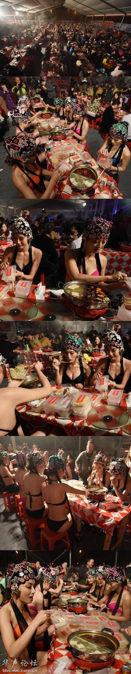 2015年11月21日晚6:20,华东首届万人火锅宴在安徽合肥滨湖“中国鼓”展示中心边举行,数千名当地市民参加这场免费的火锅宴席狂欢。在活动现场,除了热气腾腾的火锅,一拨身着“京剧”比基尼的女孩惊艳亮相,除了进行比基尼展示外,还和市民一道品尝火锅。(网易新闻11月22日)