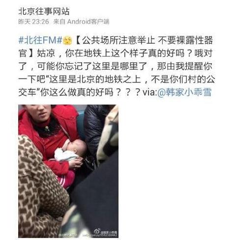 公益组织官微称地铁哺乳为裸露性器官被批。近日,北京地铁上,一妈妈在哺乳时被拍下。@北京往事网站发布了一条微博:“【公共场所注意举止,不要裸露性器官】姑凉,你在地铁上这个样子真的好吗?哦,对了,可能你忘记了这里是哪里了,那由我提醒你一下吧,这里是北京的地铁之上,不是你们村的公交车,你这么做真的好吗?”这条微博在发布后数小时后,引来万余次转发和评论。在一边倒的质疑声中,@北京往事网站删除了上述微博,并于29日凌晨发布致歉声明。(11月29日澎湃新闻)