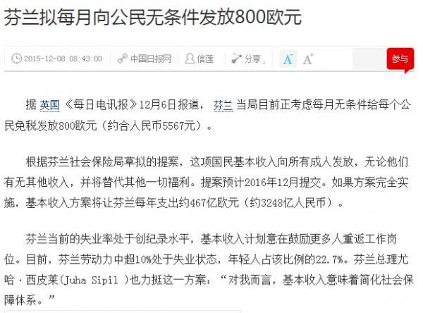 这两天,一则"芬兰每月向公民无条件发放800欧"的消息,在某些人的推波助澜下,震惊了国内网友。