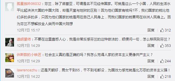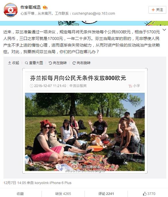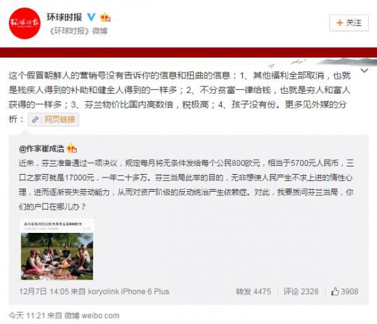 这 个"某些人",首推@作家崔成浩。昨天(12月7日)14时5分,他在微博转发这条新闻并二次加工:"近来,芬兰准备通过一项决议,规定每月将无条件发给 每个公民800欧元,相当于5700元人民币(准确应该是约5564元人民币,观察者网注),三口之家可就是17000元,一年二十多万。芬兰当局此举的 目的,无非想使人民产生不求上进的惰性心理,进而逐渐丧失劳动能力,从而对资产阶级的反动统治产生依赖症。对此,我要质问芬兰当局,你们的户口在哪儿 办?"