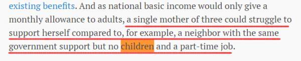 首先,其他福利全部取消,也就是残疾人得到的补助和健全人得到的一样多,并且孩子没有份。外媒的原报道中,假设了这样的场景:由于芬兰该计划只会向成年人发放薪金,一位三个孩子的单身母亲可能因此不得不艰难过日,而拥有相同政府支持、没有孩子,且有一份兼职的邻居,生活则相对轻松许多。