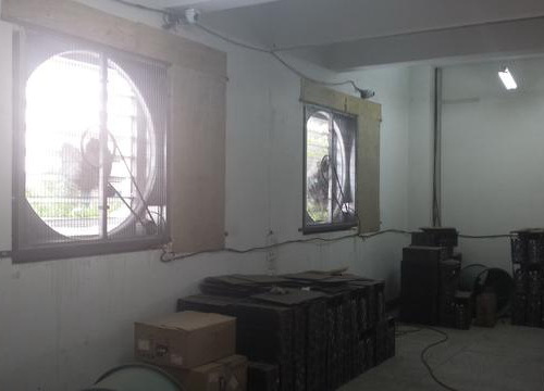 当记者逐渐靠近一座建筑物的时候,卷风机形成的强风几乎让人无法前行。而在这些卷风机的身后,则是不可计数的机器。