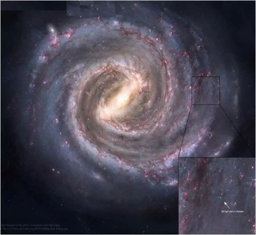 从人类第一次发送无线电信号到现在已经过去了100多年,我们的无线电传播的空间大概是一个半径100多光年的球。具体范围就是下图中的蓝点。