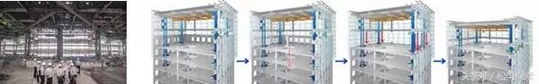 楼顶还有支撑重型设备的地板是用千斤顶顶住的。上层拆好后,千斤顶可以把它们降下来。
