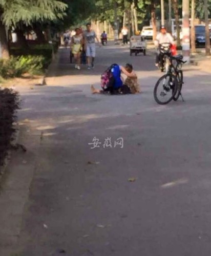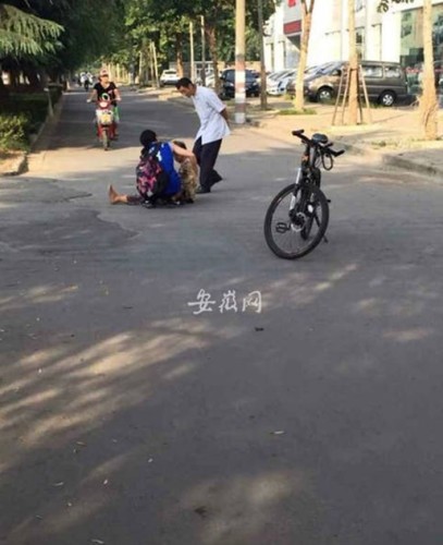 目击者说,当时她和室友去淮南师范学院吃饭,与和小袁对向而行。事情发生之前,她看到老人走路不稳,一崴一崴的。后来,小袁骑车从老太身边经过,但不知道什么原因,老太就倒地了。当时小袁骑车已经过去了,老太又喊住小袁,小袁把车子停下,将老太扶着坐了起来。她当时犹豫是不是过去,后来还是过去了,和小袁一起帮老人揉腿。