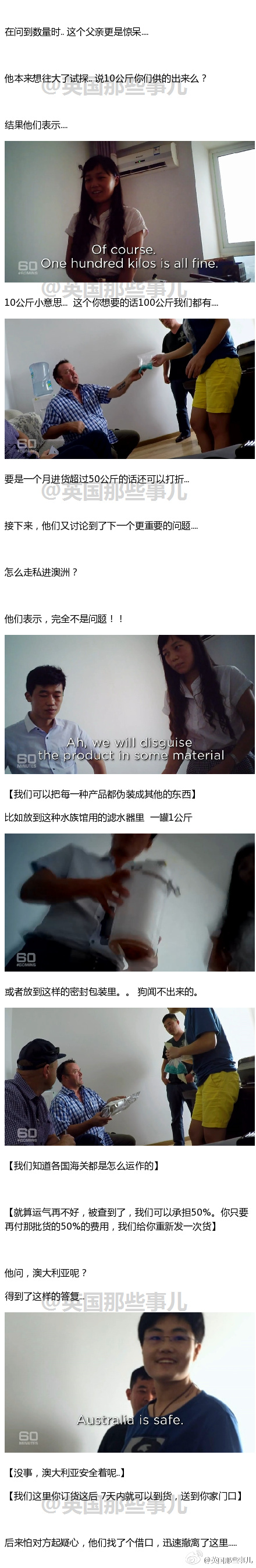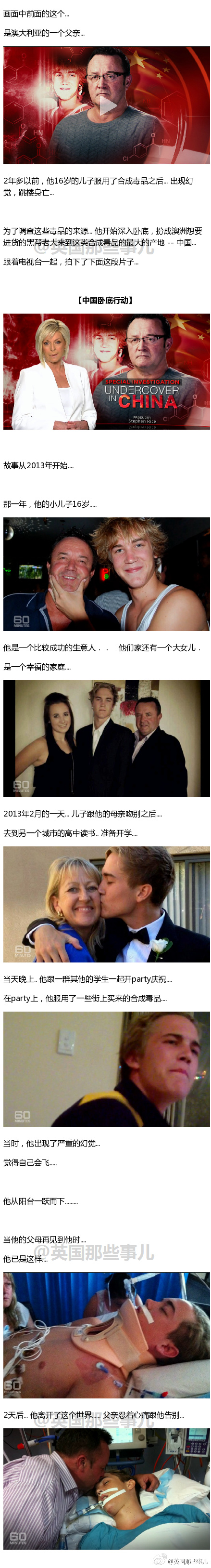 @英国那些事儿 :【中国卧底行动】 澳洲一个16岁的少年服用了致幻剂跳楼身亡之后.... 他的父亲为了调查 这些致幻剂的来源... 深入卧底,扮成要进货的澳洲黑帮老大来到中国.... 跟电视台合作偷拍下了这段20分钟的纪录片.... 就来跟大家说一下整部片的完整内容....