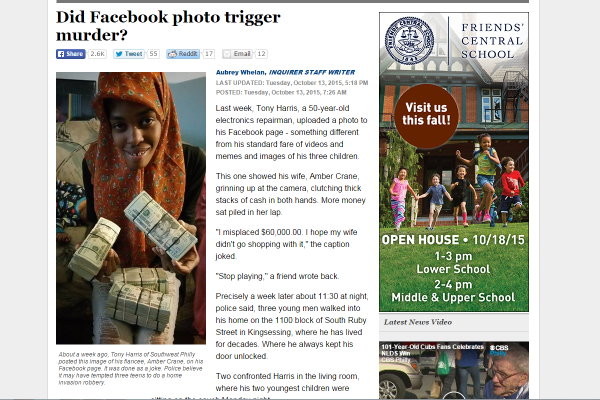 不料就在照片po出一周之后,哈里斯就遭3名蒙面歹徒闯入家中枪杀,送医急救后仍宣告不治。警方调查发现,哈里斯在死前,曾和妻子遭到3名年约17至19岁的男子挟持和索取现款。当地警方表示,他们怀疑哈里斯的死恐与这则贴文有关,目前还在调查。