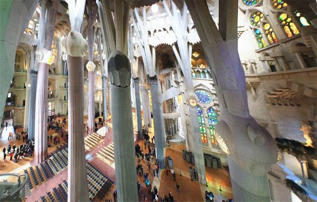 高耸的立柱、天花板的装饰,可以看出高迪设计时受到大自然的启发