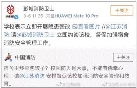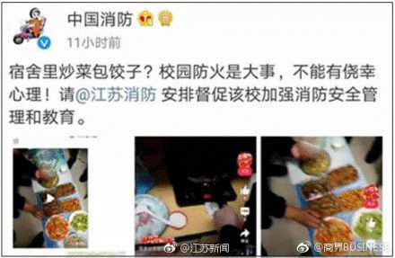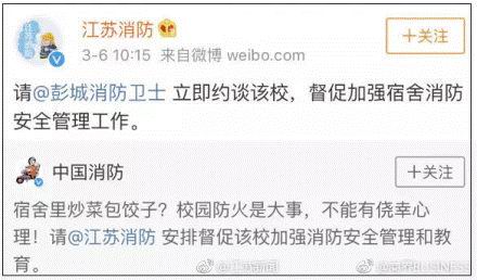 . 3月6日,中国消防.转发一"炒菜包饺子"的微博视频,定位为中国矿业大学学生宿舍,随即督促江苏消防加强安全管理,徐州消防支队秒速接力约谈学校。校方对表示,非常重视正在.调查,学校对管理要求非常严格,这是安全事故。不久前,阿消曾出手,"端掉"江西师范大学研究生"仙女寝室"。