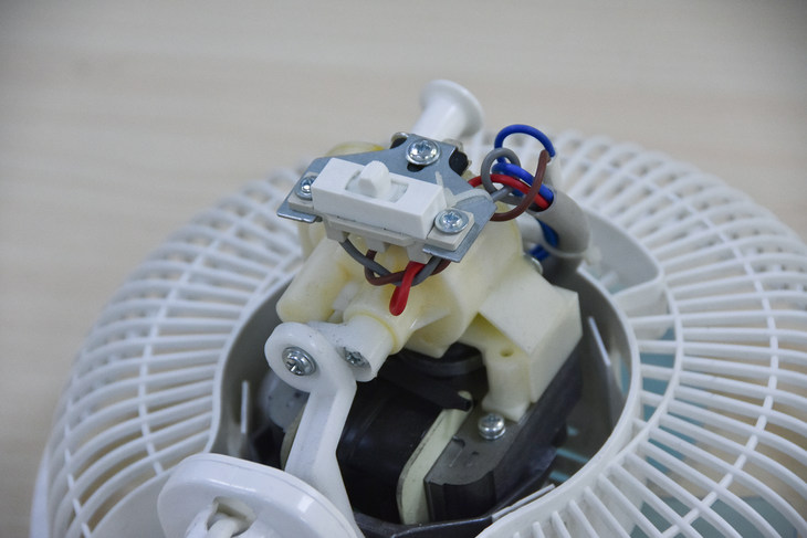 接下来把电风扇拆开,对于这种小风扇来说拆卸还是比较容易的,找到原来的挡位开关的接线柱,这里一共有三根线,其中1挡接线柱上的那根线是没有用的,安全起见使用绝缘胶布包好,然后只需要把剩下两根线接到无级调速开关上就可以了。