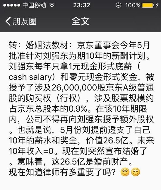 这26.5亿算作婚前财产没有问题,但刘强东的资产肯定不止这26.5亿。2014年,刘强东以530亿元人民币的财富位列《胡润百富榜》第九,26.5亿只是他个人资产很小的一部分。而这2600万股在结婚后,也并非完全属于婚前个人财产,在此前的法院判决中已有相关案例,广东省高院2009年的批复中就认定,婚姻关系存续期间通过行使股票期权获得的该部分股票财产权益,属于在婚姻关系存续期间明确可以取得的财产性收益,宜认定为夫妻共同财产。
