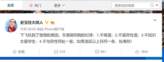 有人的地方就有江湖,有江湖的地方就有八卦。在互联网这个风云变幻、人潮拥挤的圈子里,从来都不缺八卦,关于大佬的八卦总是为人们津津乐道。12月17日上午,巨人网络董事长史玉柱在其个人认证微博上写到:“下飞机到了傲慢的美国。在美期间我的纪律:1、不喝酒;2、不灌异性酒;3、不结识女留学生;4、不与异性同处一室。如果违反以上任何一条,处阉刑!”据史玉柱微博介绍,目前其仍为“单身狗”。