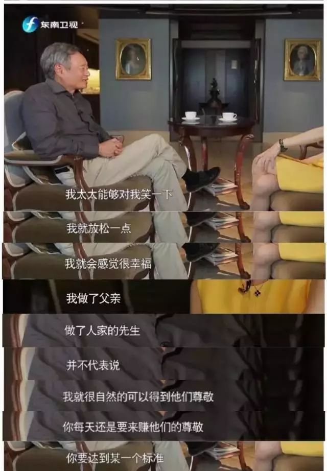 这让我想起李安。之前他的一则采访刷屏,里面提到国际知名导演,在家庭中却仍然谦卑,表示自己最大的幸福是「太太对我笑一下」。