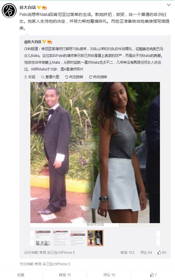 CNN报道:肯尼亚某律师打算用70头绵羊,30头山羊和50头奶牛当聘礼,迎娶美总统奥巴马女儿Malia。这位名叫Felix的律师表示自己并非是看上奥家的财产,而是出于对Malia的真爱。他说他08年就爱上Malia,从那时起就一直对Malia忠贞不二,几年来没有再跟任何女人交往过。08年Malia才10岁…