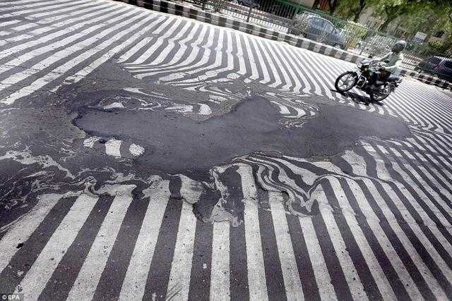 夏日来临,人们总会说:“热死人了”。但很不幸的是,这句“热死人了”在印度一语成谶。印度多地持续十多日的异常高温天气已导致接近1500人死亡。印度地处南亚次大陆,属于热带季风气候,独特的地理条件造就了酷热难耐的天气。天气预测显示,高温天气还会持续至下个星期。逼近50摄氏度的高温不仅活人受不了,马路也受不了。图为印度首都新德里马路因高温“熔化”,斑马线已严重变形。