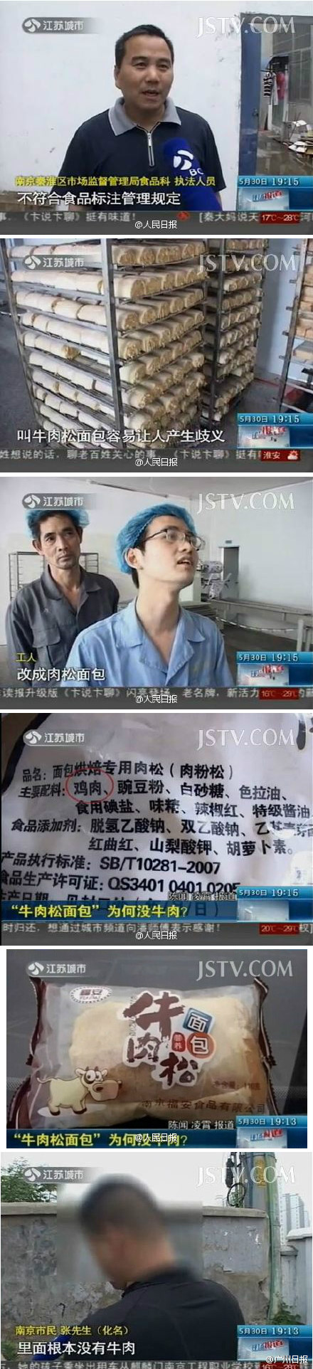 南京张先生买了款牛肉松面包,包装上还有只卡通牛,可配料表里却没牛肉,只标明了鸡肉、豆粉、添加剂等。企业负责人解释:“牛”肉松的意思是这个肉松很牛……监督管理局人员表示,该产品不符合食品标注管理规定,必须整改。