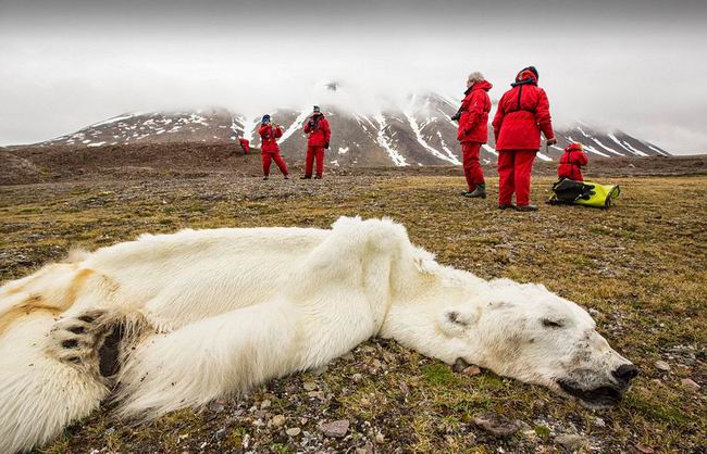 正常情况下,挪威斯瓦尔巴群岛西部峡湾冬季会结冰,现在全年都没有冰。这头北极熊因无处觅食而亡。