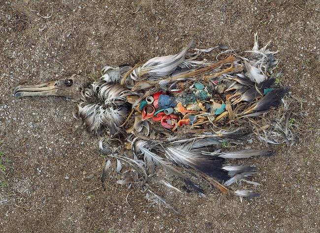 在远离世界贸易中心的中途岛上,一只信天翁因吞食太多塑料死亡,尸体在海滩上腐烂。
