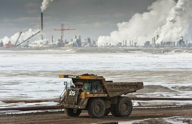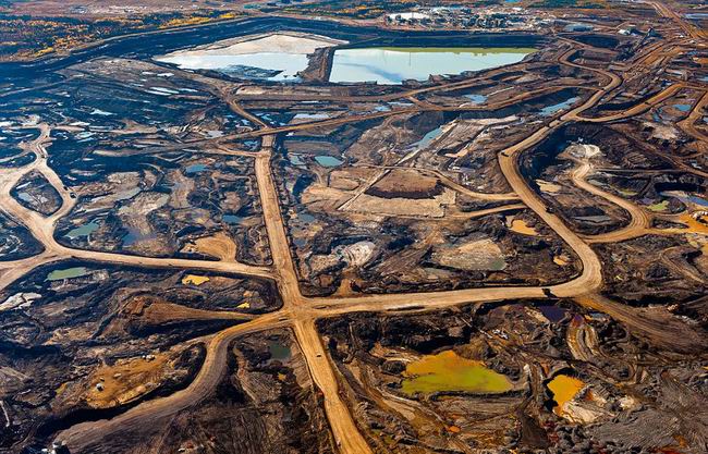 加拿大亚伯达的油砂区鸟瞰图,这里的采矿和尾矿池非常庞大,在太空中都可看到。