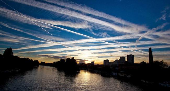 全球化运输网络是空气污染和温室气体排放的罪魁祸首之一,特别是商业飞机。图中是伦敦泰晤士河空中留下的航空尾迹。