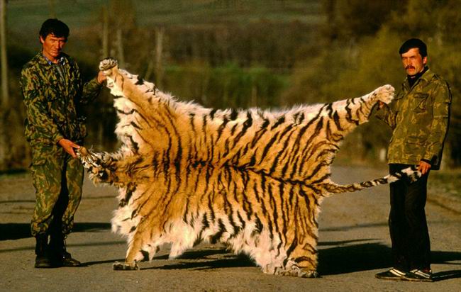 俄罗斯西伯利亚地区,从偷猎者处缴获的西伯利亚虎虎皮。