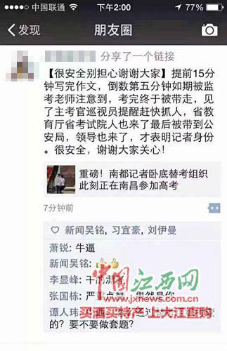 “我进场考试,最后在考卷上写明卧底一事,请求考卷作废相关部门介入调查。”卧底记者在微信朋友圈上透露,自己提前15分钟写完作文,在考试结束前5分钟被监考老师注意到,考完后被带走,“见了主考官巡视员提醒赶快抓人。”