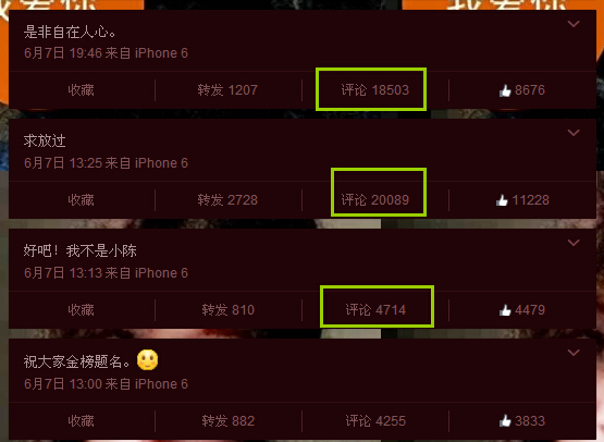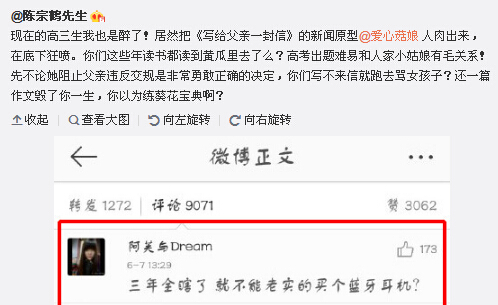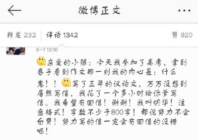 没想到,一封书信让众多高三生“气急败坏”。考试结束没多久,小陈明华被人肉出原型是微博用户@爱心菇娘。其微博随后被刷屏,不到半小时发了3条微博,先解释“我不是小陈”,但考生并不买账,继续吐槽着“练了3年的议论文,就因为你举报你爸要写信”,小编从4000多条评论中随手摘几条: