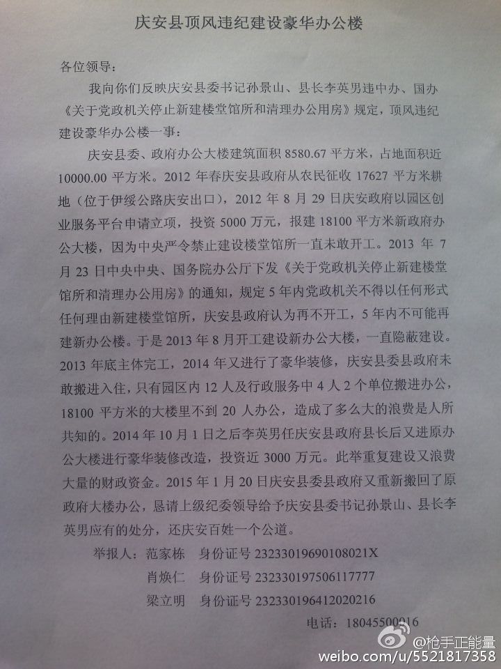 这份日期为2015年2月12日的举报信称,庆安县委、县政府顶风违纪先建设一栋豪华办公楼,然后又耗费3000万元对县政府原大楼进行奢华装修。