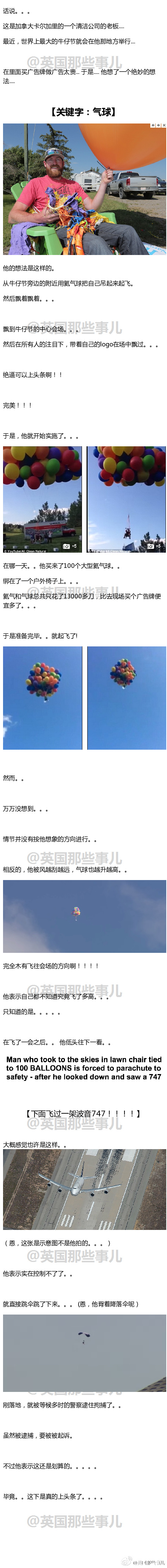 话说,一个哥们为了给自己公司打广告.... 用100个气球绑着自己飞上了天~ 呃.... 然而事情并没有按他想象的方向发展........