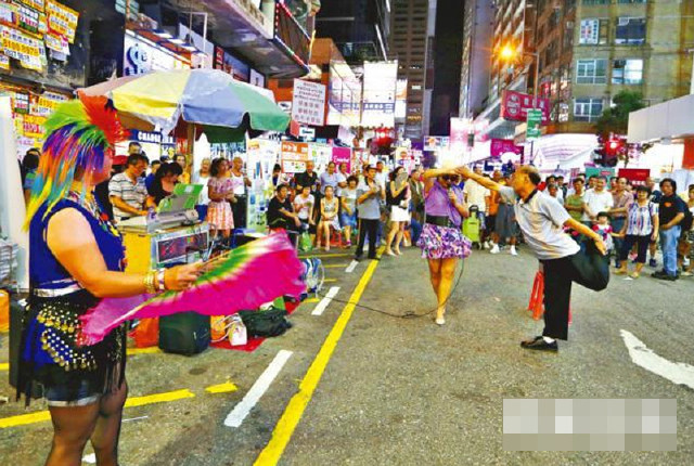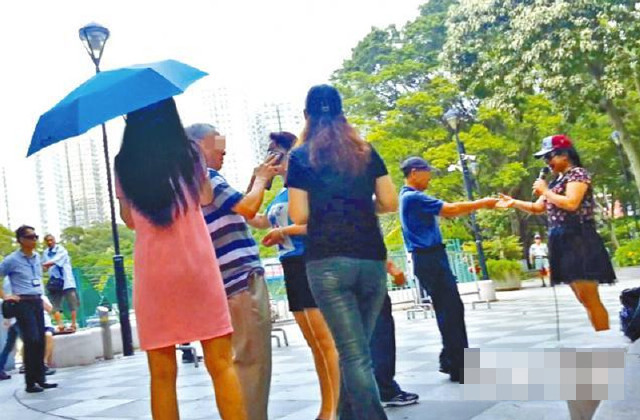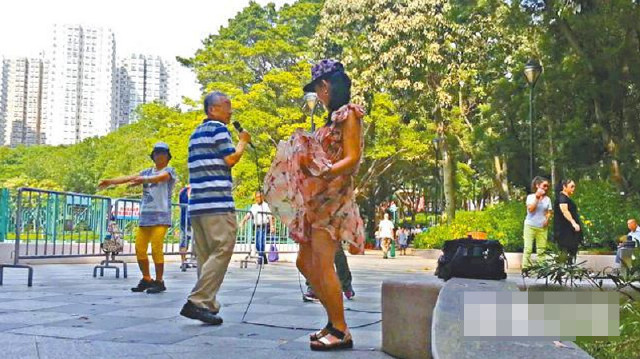 但据港媒报道,这批在旺角跳广场舞的大妈其实不只由内地人构成。其中一些人来自香港的屯门公园。据悉,近年来,一些香港的家庭主妇也热衷组成歌舞团,在公共场所跳舞唱歌,部分港媒和市民对这批香港大妈赞赏有加。”图为屯门公园内的大妈打扮得花枝招展,为唱歌老翁伴舞。