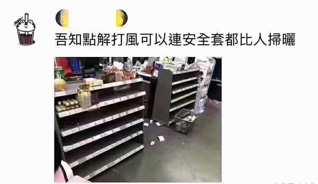 比如山竹吹袭广东前,大家都在扫超市囤干粮囤食物,有个人居然把整个超市的套套都扫光了。。。