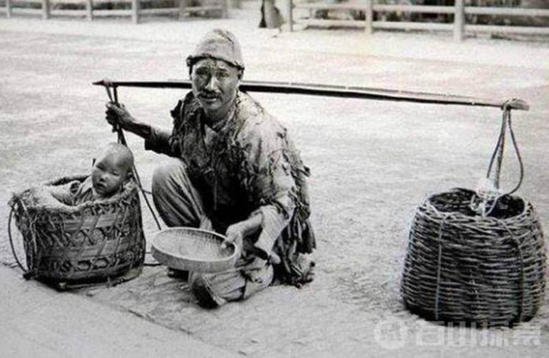 5、用扁担挑着自己孩子在街边乞讨的乞丐,很可怜!
