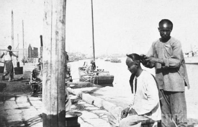 2、码头上的理发师,那时候男子的长头发也是需要打理的。