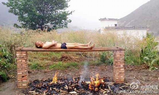 家住云南云龙县25岁贾槟珲13年患上白血病,目前家里积蓄已被花光,近日他在自家菜地里搭建了木烤杆,把火烧起来之后,躺在木烤杆上让火炭烤。在42℃的高温持续半个多小时以上。烤一会就下来烧一会火,烤几天我再去医院检查,看看癌细胞有没有被杀死。