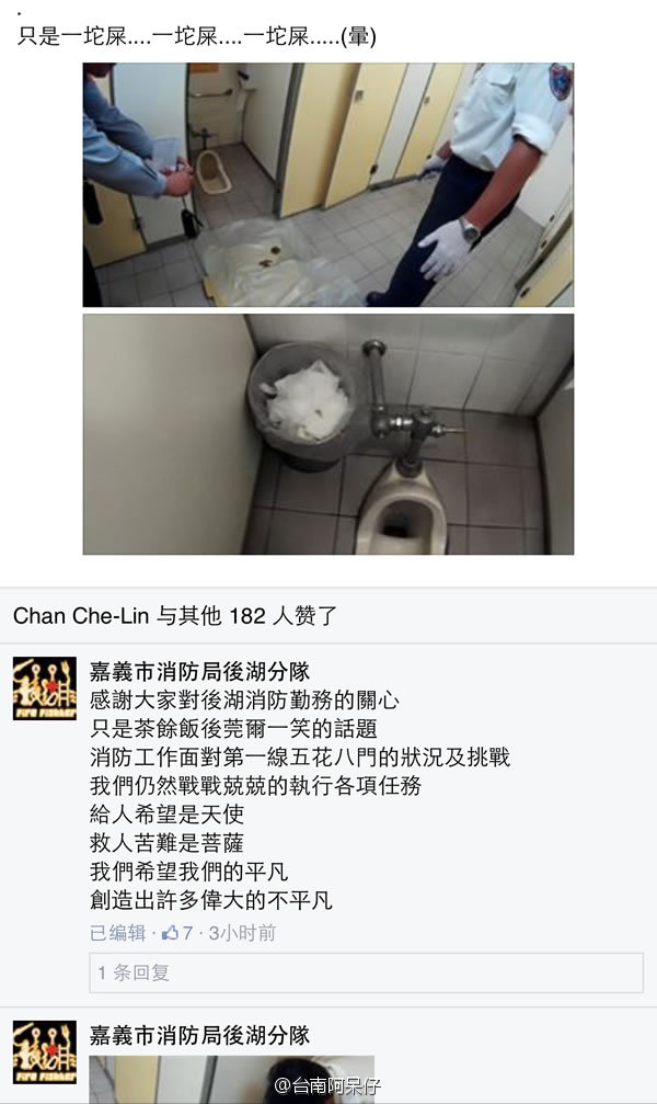 嘉义市消防局接到民众报案:有孕妇在公厕跌倒,马桶里有带血的弃婴。消防员紧急赶往现场救援,没想到最后,打捞上来“弃婴”其实只是一坨屎...(消防员叔叔还认真拍照上网,快把我笑死了哈哈哈) #台湾趣事#