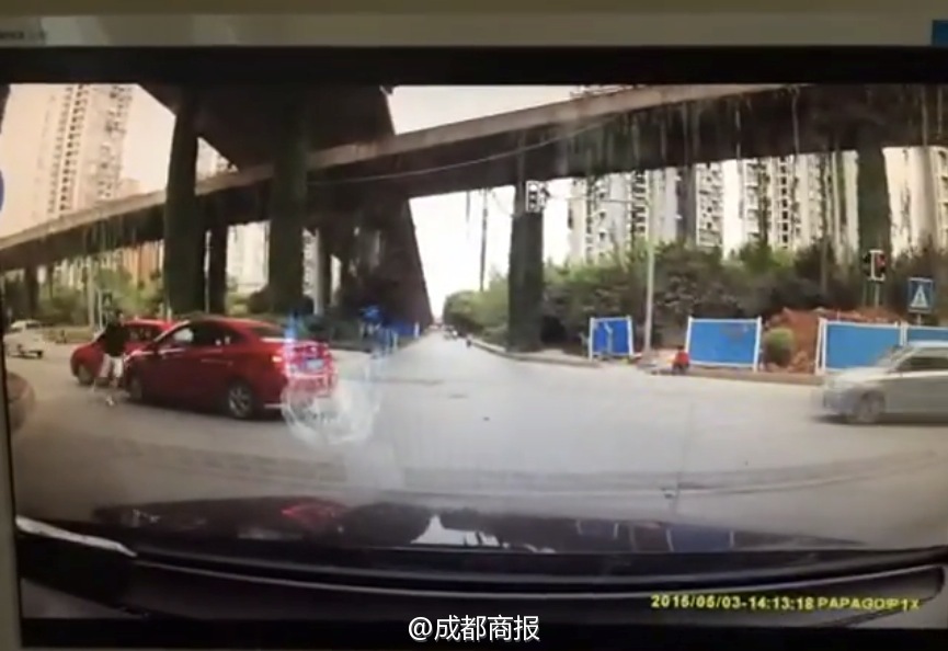 成都商报5月3日消息 今日下午2:13左右,段小姐的车载记录仪拍摄到在骄子立交一十字路口,一男性司机停车后把一女司机拉下车开始痛殴。据段小姐透露,目前该嫌犯已被成龙路派出所控制,疑似该男子的车在高速上被女子的车刮擦,车上有小孩,他便一路追到骄子立交。案件目前正在调查中。