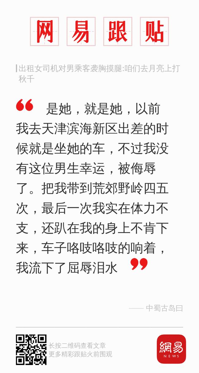 男子坐出租遭女司机袭胸摸腿.的姐:咱们去月亮上打秋千吧
