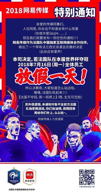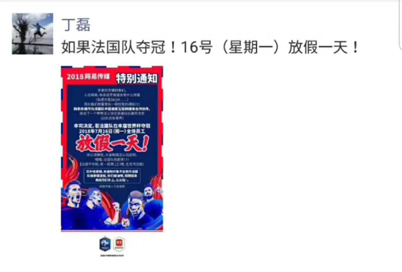 众所周知,前两天丁爸爸发话说:只要法国夺冠,网易就放假一天!