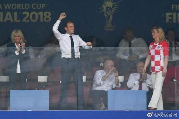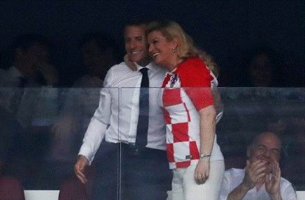 可能是因为太高兴,法国队锁定胜局,马克龙第一时间与克罗地亚美女总统科琳达亲密贴面致意,而一边的FIFA主席因凡蒂诺,只好整理自己的裤腰带,缓解尴尬。