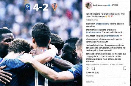 法国夺得世界杯冠军,本泽马第一时间为祖国送上祝贺:"干得漂亮,世界冠军!"