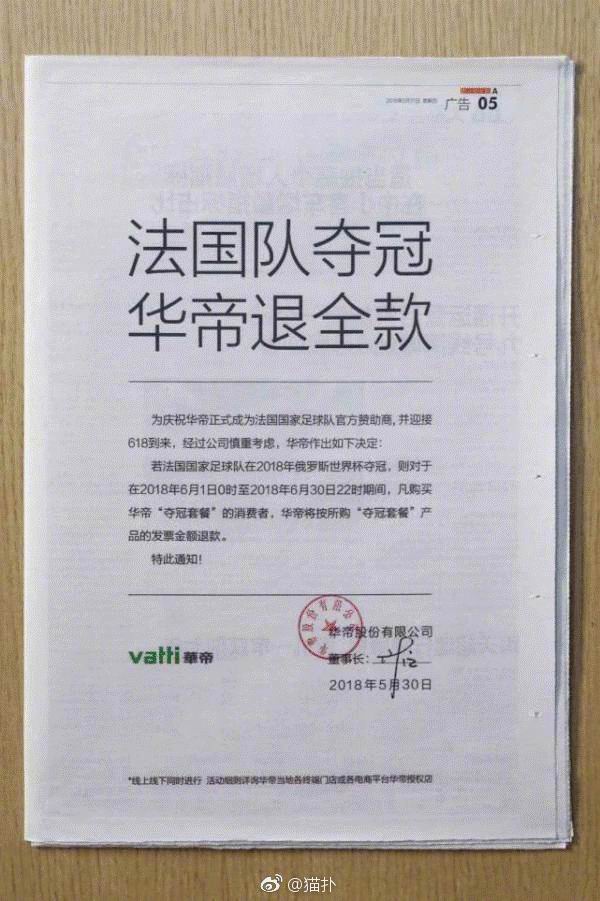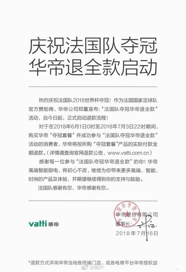 话说法国夺冠,华帝遵循承诺,第一时间启动退款程序。