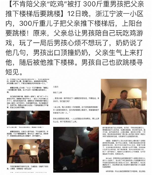 父亲让孩子陪着吃鸡,孩子不想玩游戏,孩子推父亲下楼....这新闻简直太多槽点,感觉全文就这300斤的儿子比较正常。