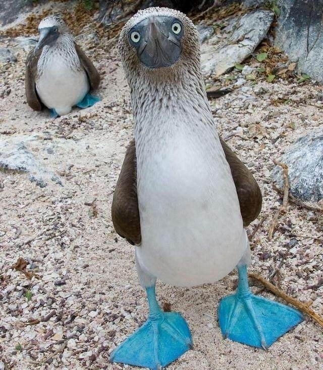 这个真的太丑萌了。蓝脚鲣鸟是一种大型的热带海鸟。主要生活在中美洲和南美洲的西海岸。亮蓝色的脚是繁殖选择的结果。雄性的脚越蓝就越吸引雌性。在求偶时,它们会用独特的舞蹈来展示自己的蓝色脚趾。