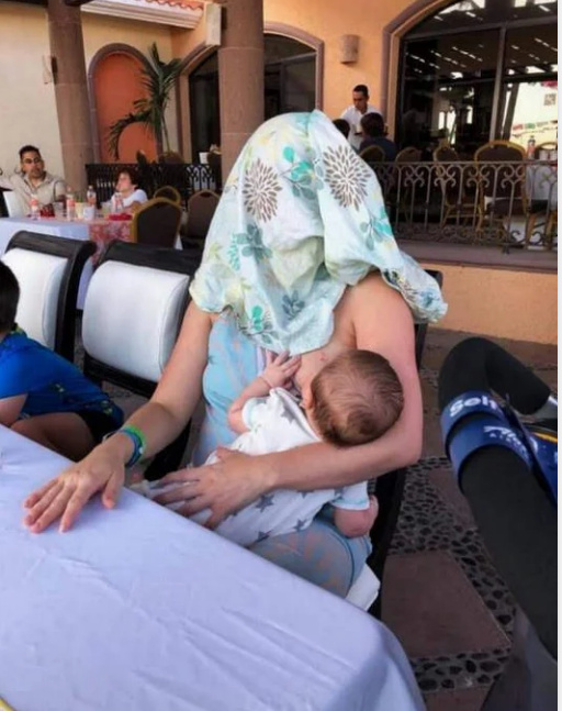 一位妈妈在餐馆里哺乳。有人过来对她说,“能不能遮一下”?于是她照办了。