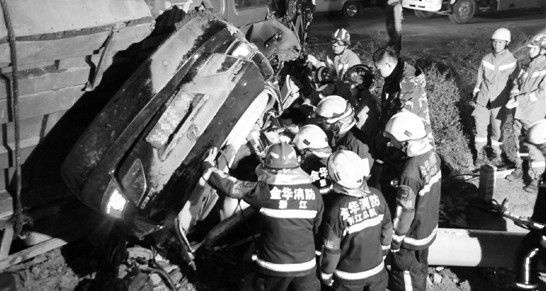 救援人员立刻动用了3台吊机,并利用液压设备等破拆工具展开救援。当晚9点15分,女司机被成功救出,并送往医院。