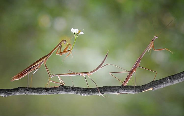 这一幕是沙乌在自家住房附近的树丛中发现的。当时一只螳螂站在树枝上,前肢中捧着一朵白色鲜花,似乎要献给它的爱人。而雌性螳螂被看到向捧花螳螂屈身,似乎接受了对方的求爱。可是,树枝上又出现第三只螳螂。