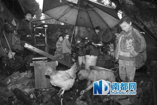 1月28日傍晚,孩子们围在煮晚饭的妈妈旁边。“厨房”就是捡来的一把大伞和几口锅。