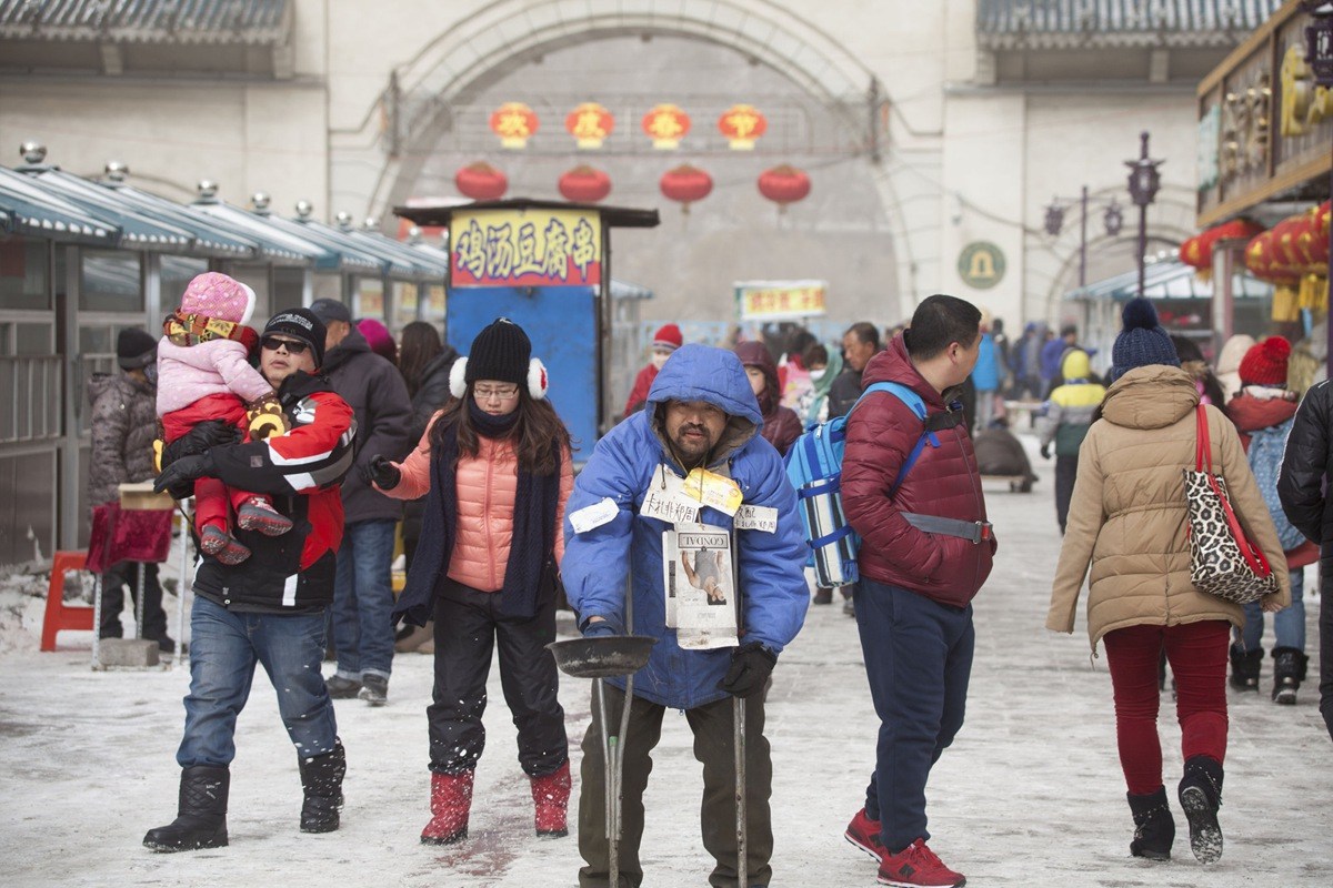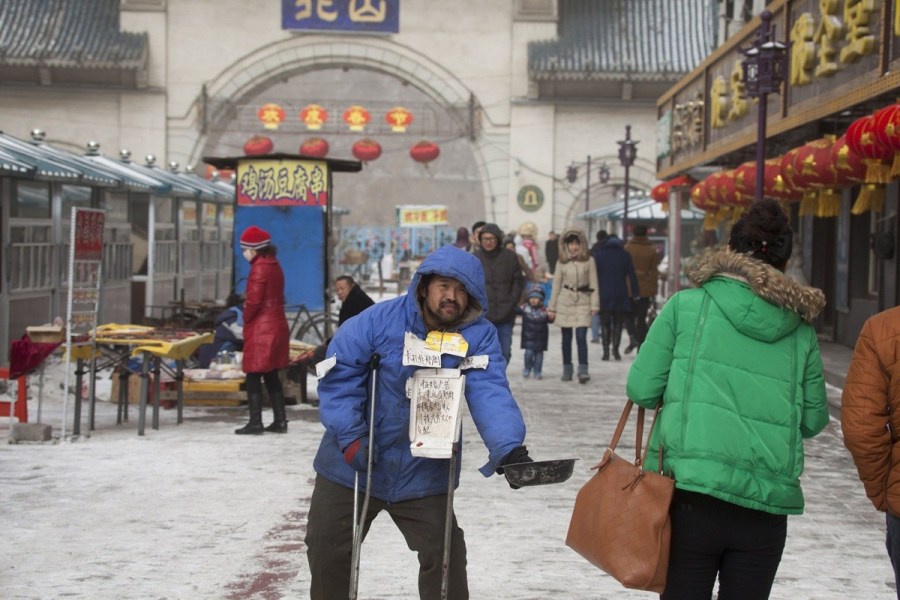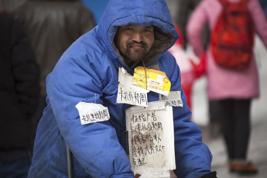 吉林一乞丐街头全身挂牌征婚