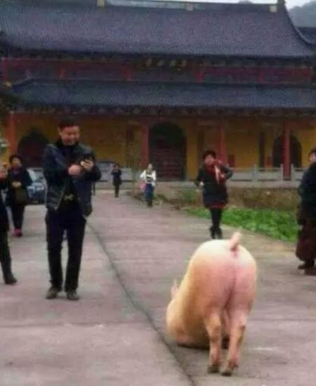 昨天16点57分,网友@杜立巴人发微博称,春节期间,浙江温州永嘉县的一头猪跑到寺院门口下跪,当时是三千佛忏法会最后一天,大伙儿一出寺院居然看见这头大猪正朝寺院山门方向跪拜,应该是跪了很久了。