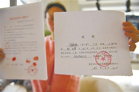 陈女士正出示孩子打狂犬疫苗的证明。